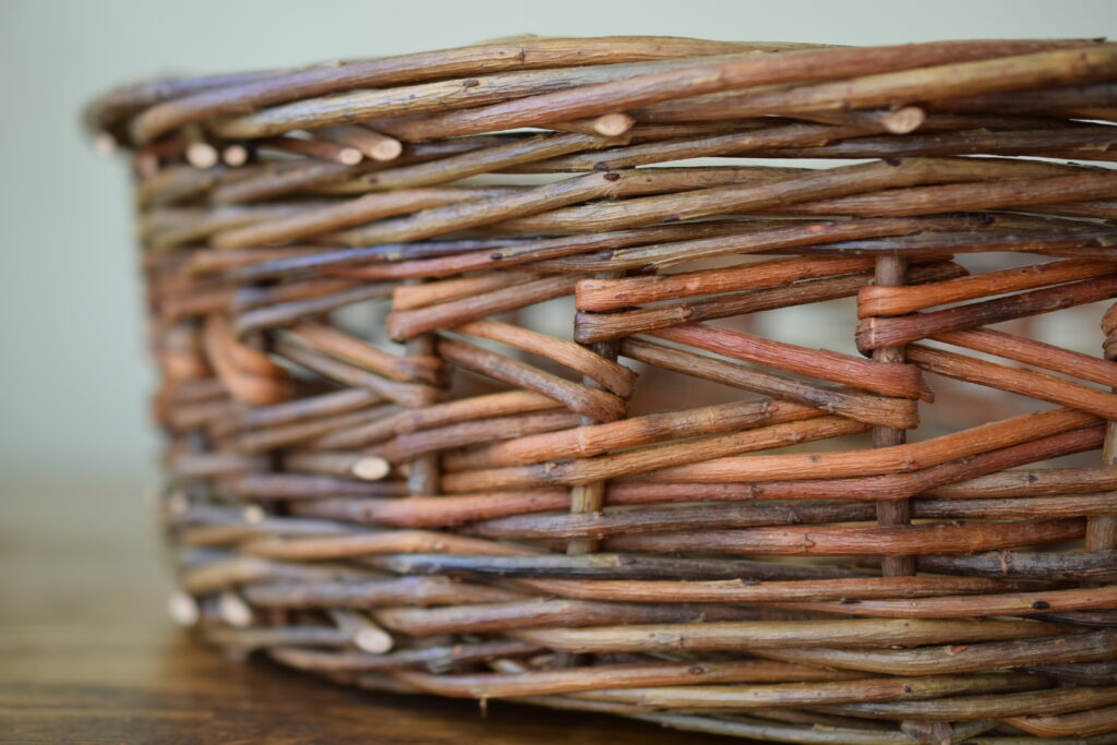 This round basket, perfect for storing a loaf of bread or seasonal fruit, has a colorful zigzag weave.
