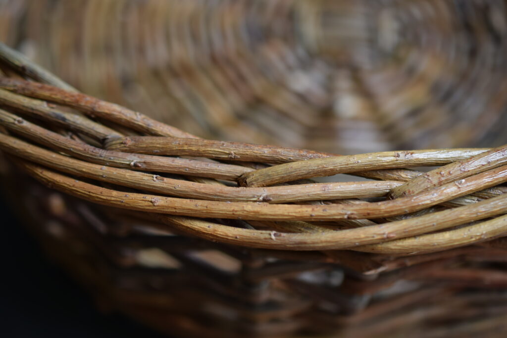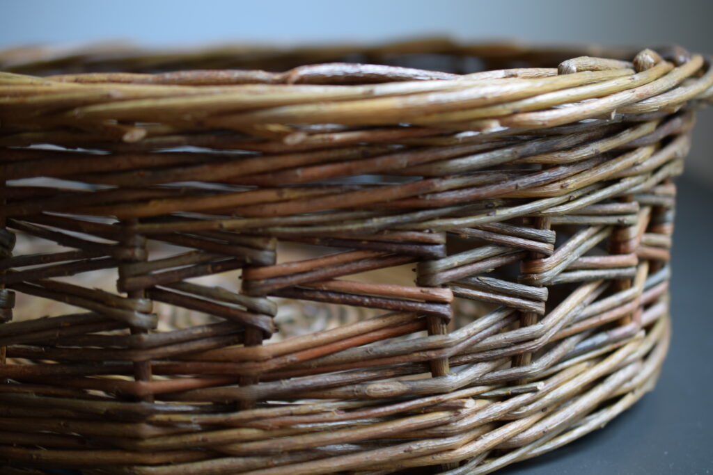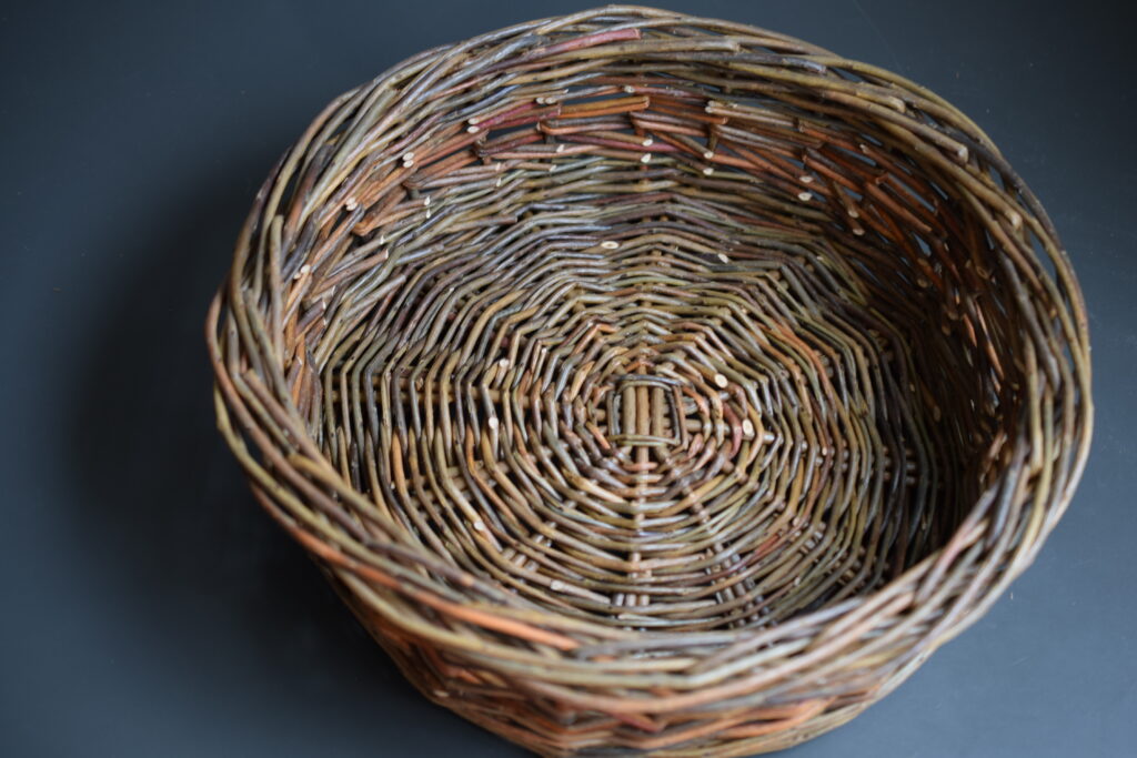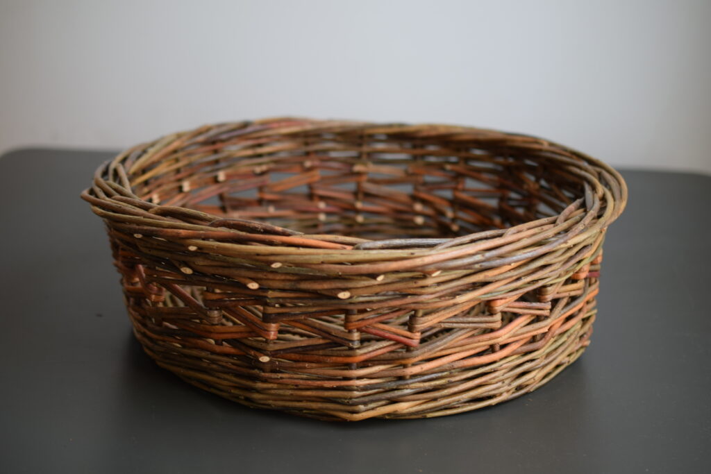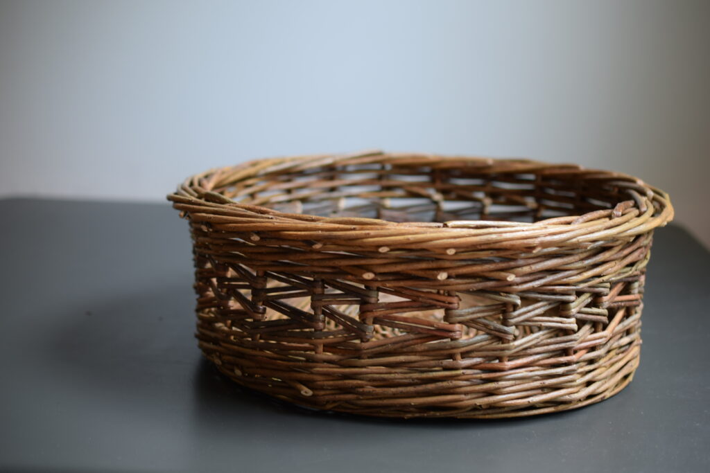 This round basket, perfect for storing a loaf of bread or seasonal fruit, has a colorful zigzag weave.